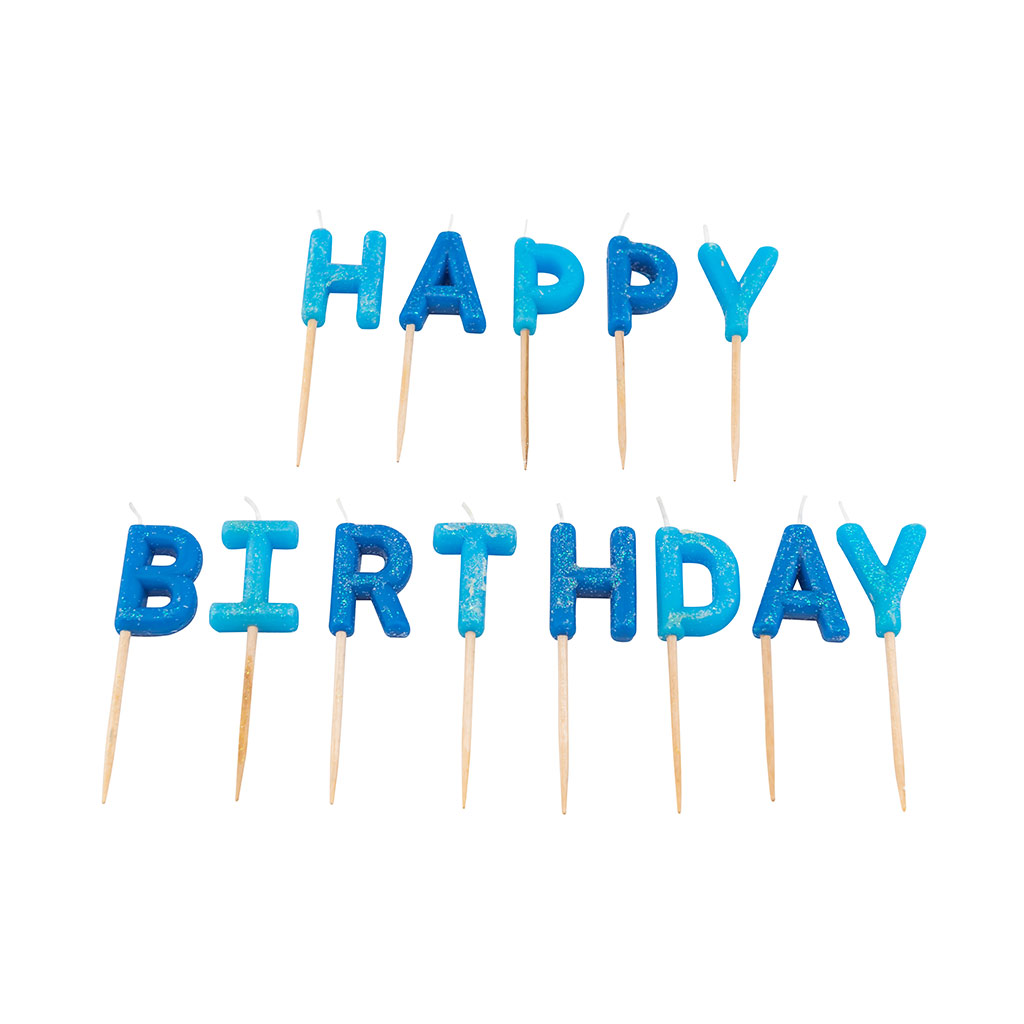 סט 13 נרות קיסם HAPPY BIRTHDAY, בשני גווני כחול. מושלמים לקישוט עוגת יום הולדת.