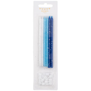 סט המכיל 12 נרות, מעוטרים בנצנצים בצבע זהב ו- 12 מחזיקי נר.