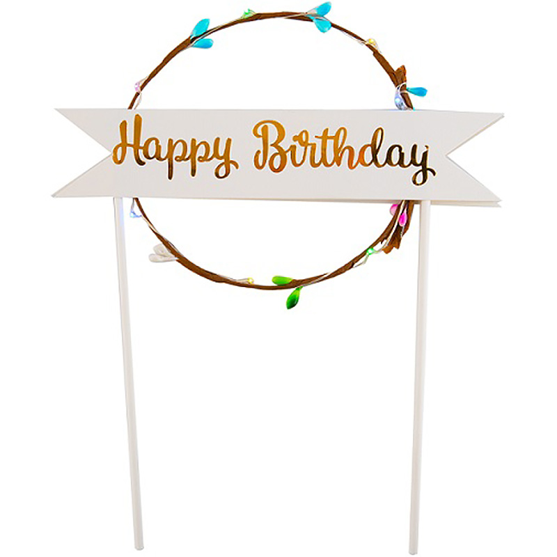 להיט! טופר גדול עטוף באורות להדלקה. בנוי על שני קיסמים לבנים וביניהם כרזת HAPPY BIRTHDAY בפוייל זהב.