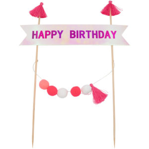 טופר קישוט מרהיב לעוגה, המורכב משני קיסמים ארוכים וביניהם שרשרת פונפונים צבעוניים. בחזית כרזת HAPPY BIRTHDAY בפוייל מוזהב.