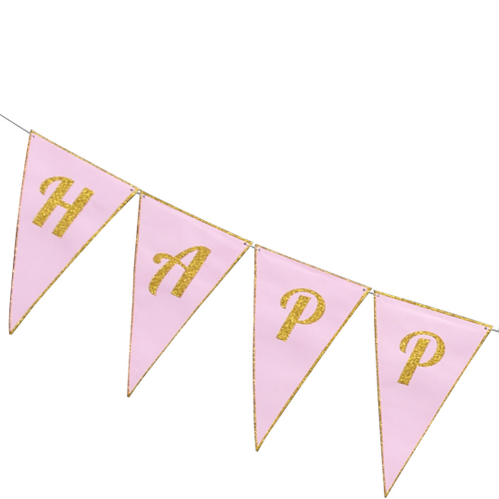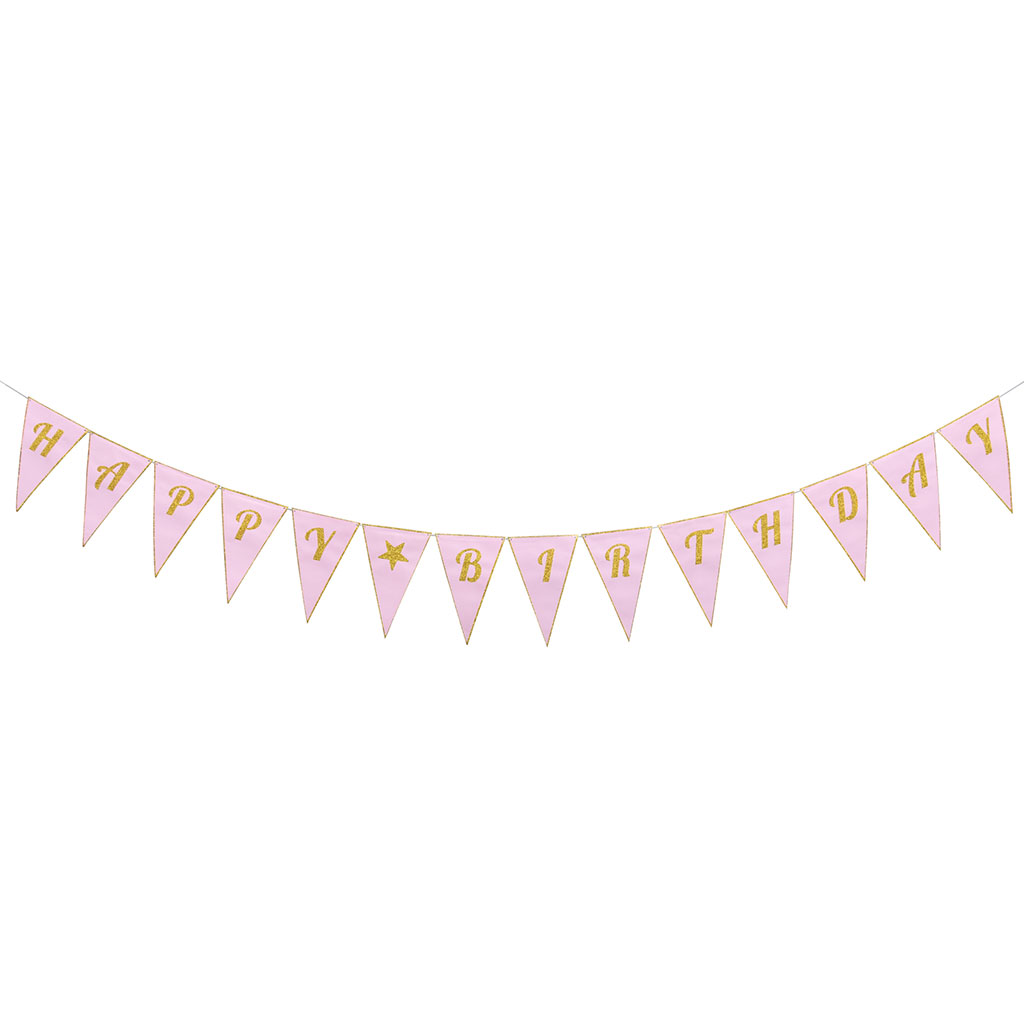שרשרת דגלים לתליה, בצבע ורוד, עם כרזת HAPPY BIRTHDAY המוטבעת בצבע זהב גליטר מנצנץ. שרשרת מרשימה מאוד שלא תשאיר אף חוגג יום הולדת אדיש!