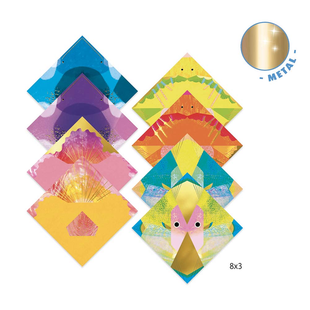 ערכה עם 24 ניירות צבעוניים ליצירת אוריגמי של שלל יצורי ים קסומים, עם הוראות קיפול צעד אחר צעד.