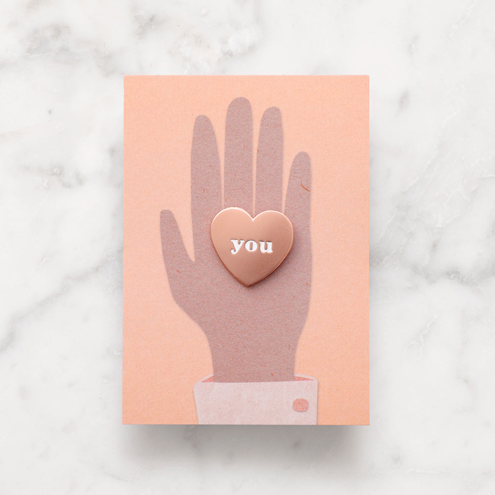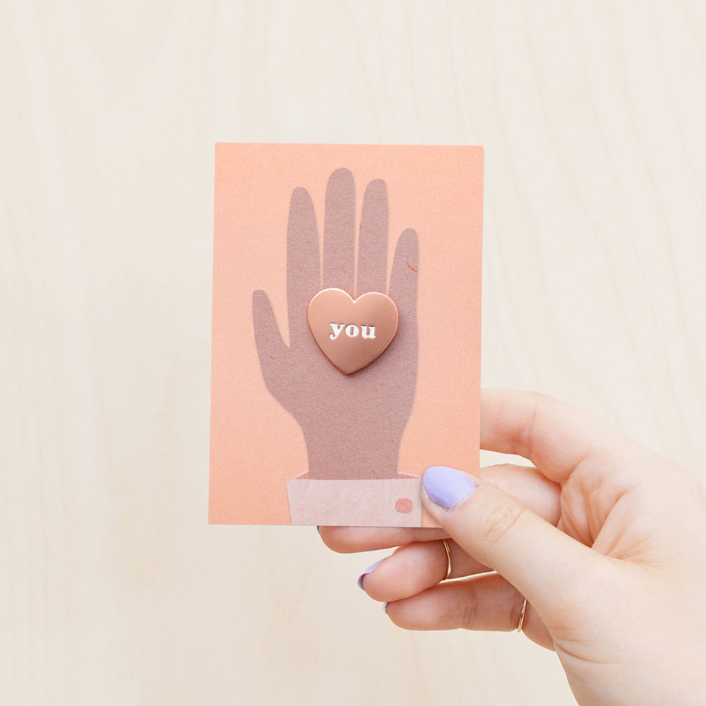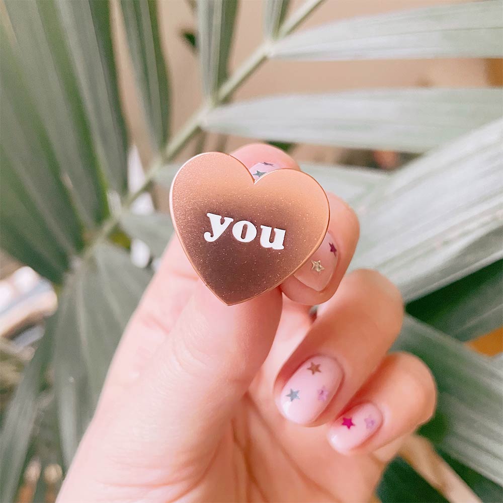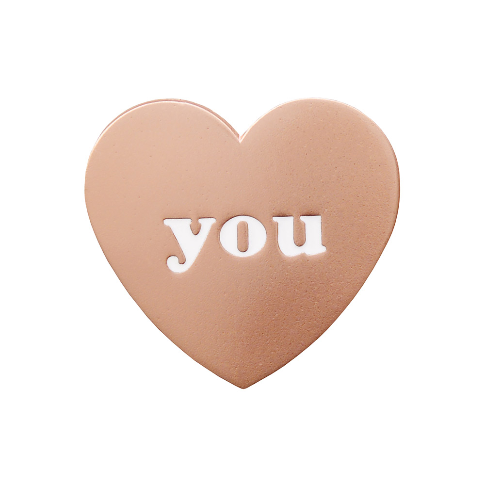 A sweet heart shaped pin made from high quality hard enamel and matt copper toned metal. Complete with a rubber clasp.