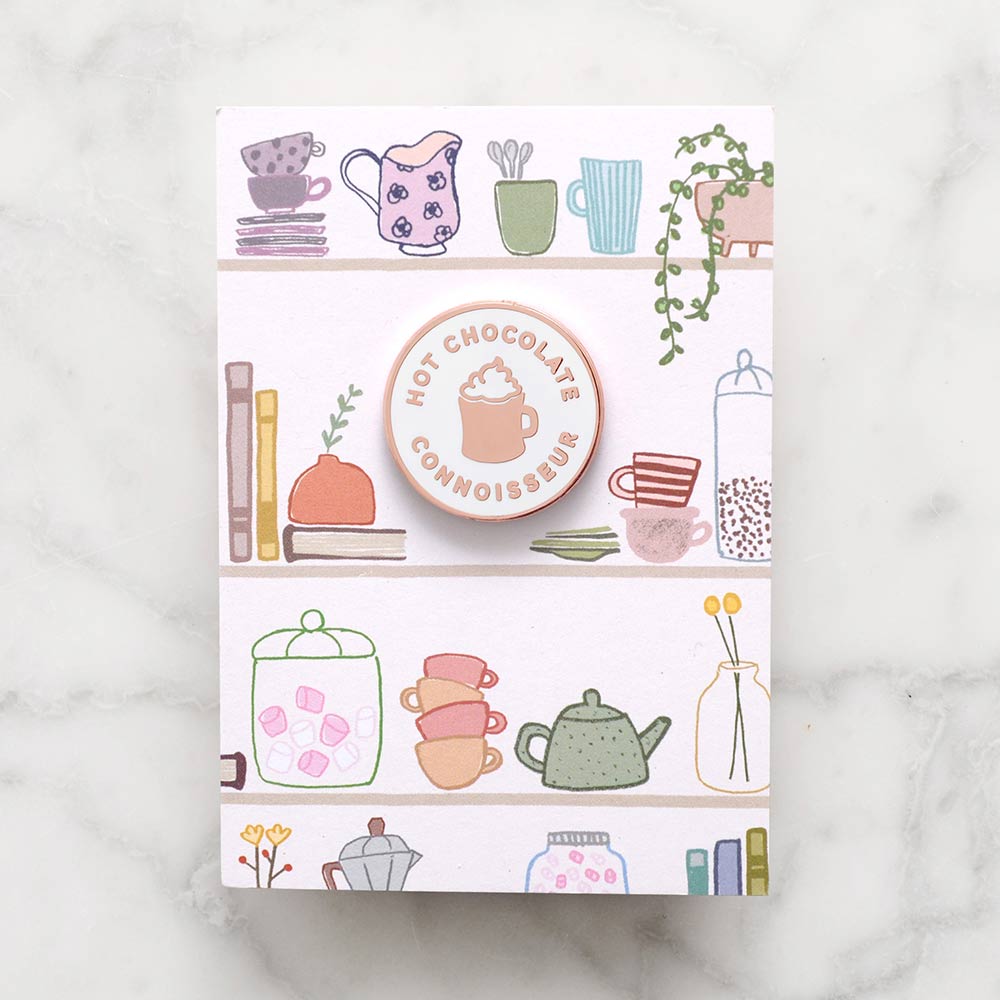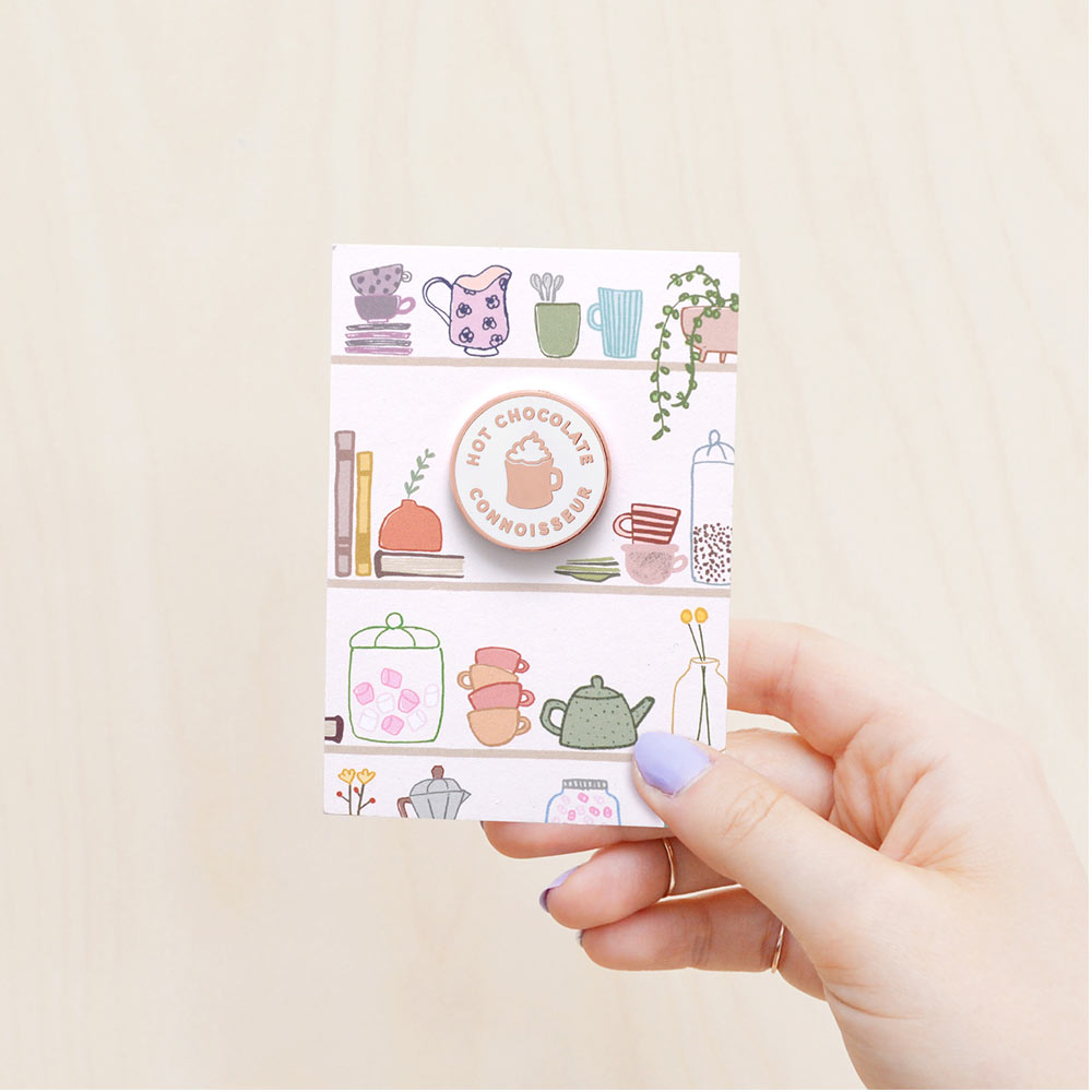 A lovely shiny little pin, featuring our 'Hot Chocolate Connoisseur' design. Made from white hard enamel and copper toned metal with a rubber clasp.