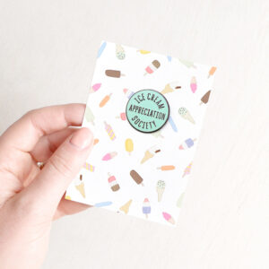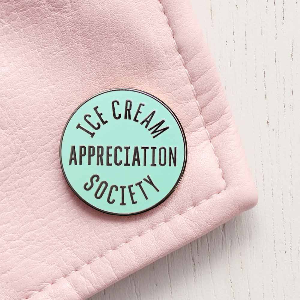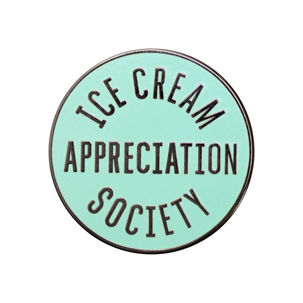 A lovely shiny pin, featuring our 'Ice Cream Appreciation Society' design. Made from mint hard enamel and black toned metal with a rubber clasp.