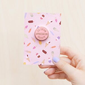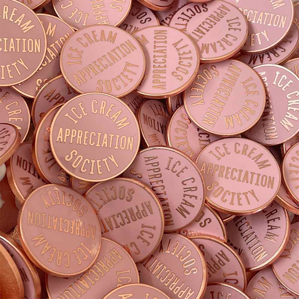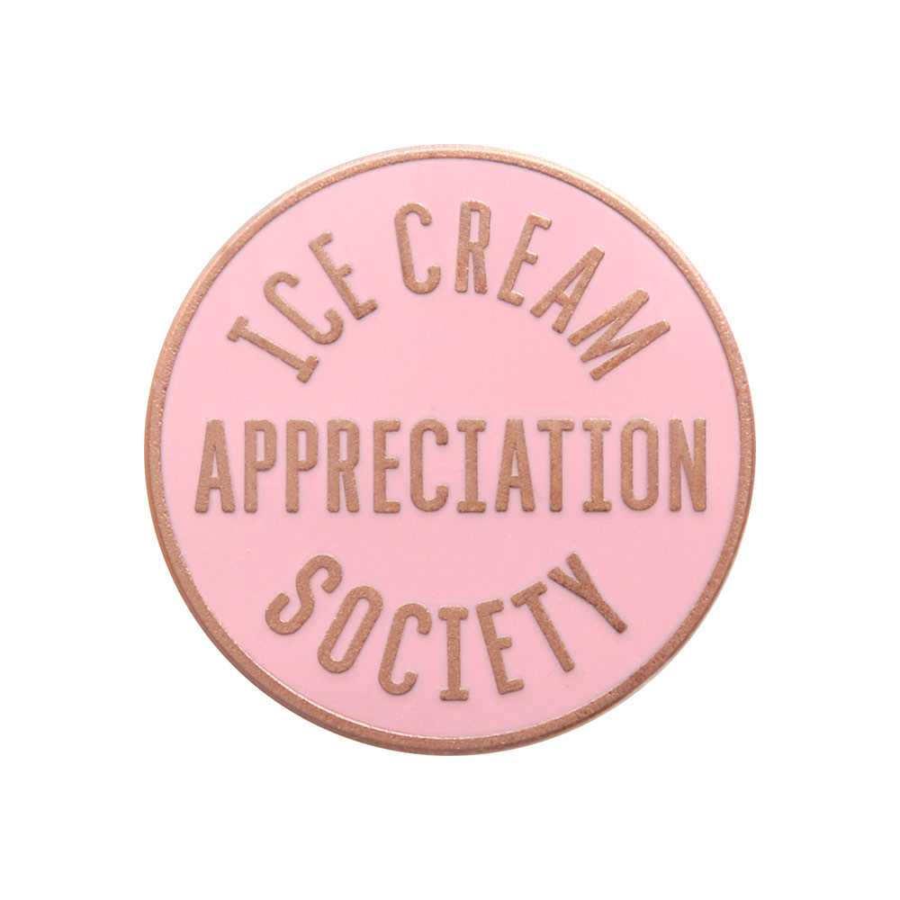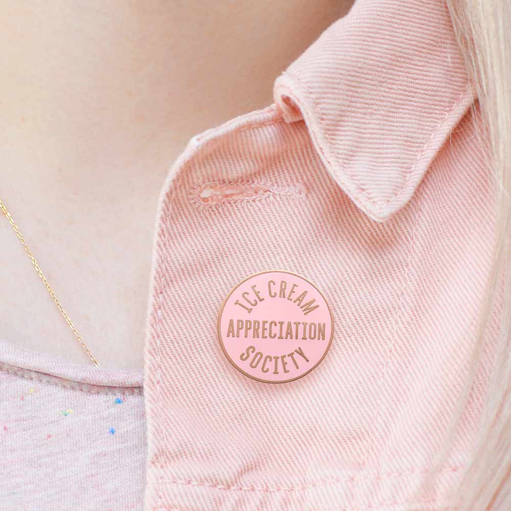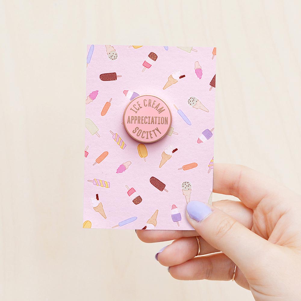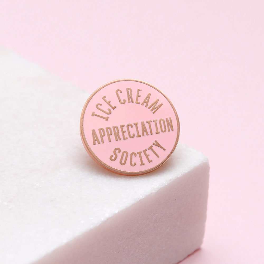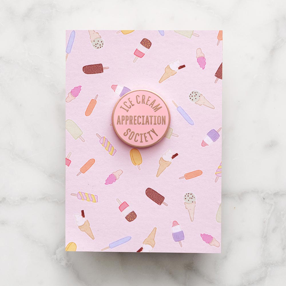 A lovely shiny pin, featuring our 'Ice Cream Appreciation Society' design. Made from pink hard enamel and matt copper toned metal with a rubber clasp.