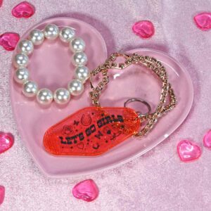 This keychain says "let's go girls" in on a glittery hot coral motel keychain.