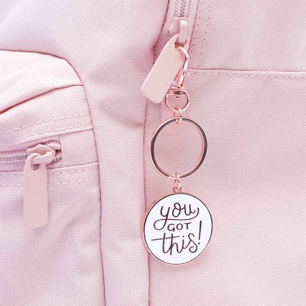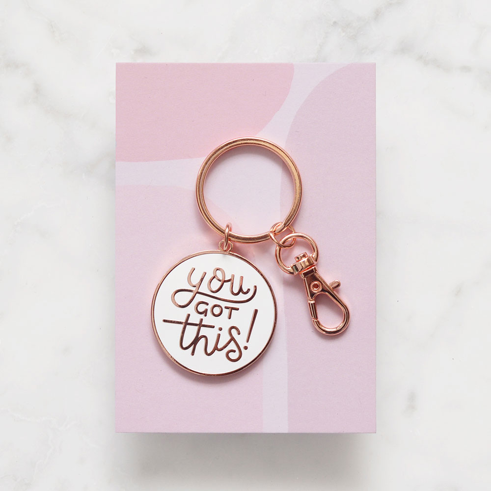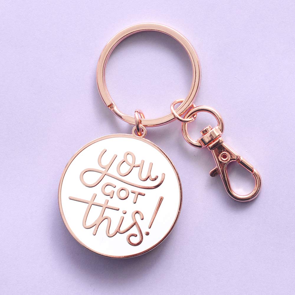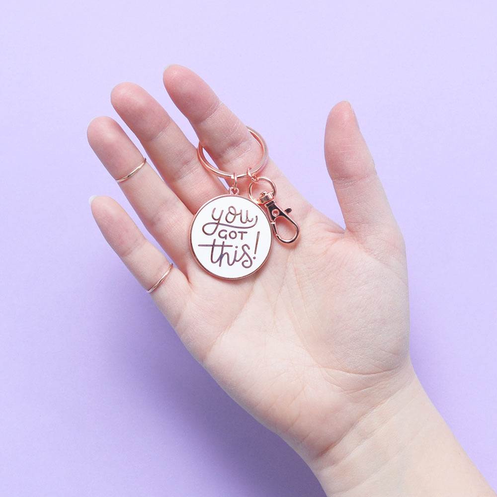 A lovely shiny keychain, featuring our hand drawn 'You Got This' design. Made from white hard enamel and copper toned metal. Complete with keyring and an extra clip, perfect for attaching to bags, backpacks or whatever you fancy adding some charm to!