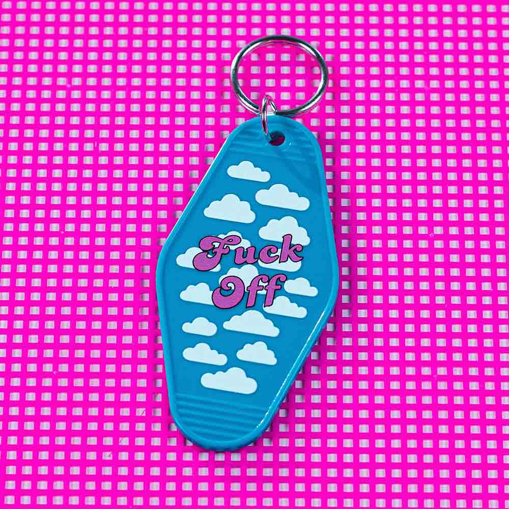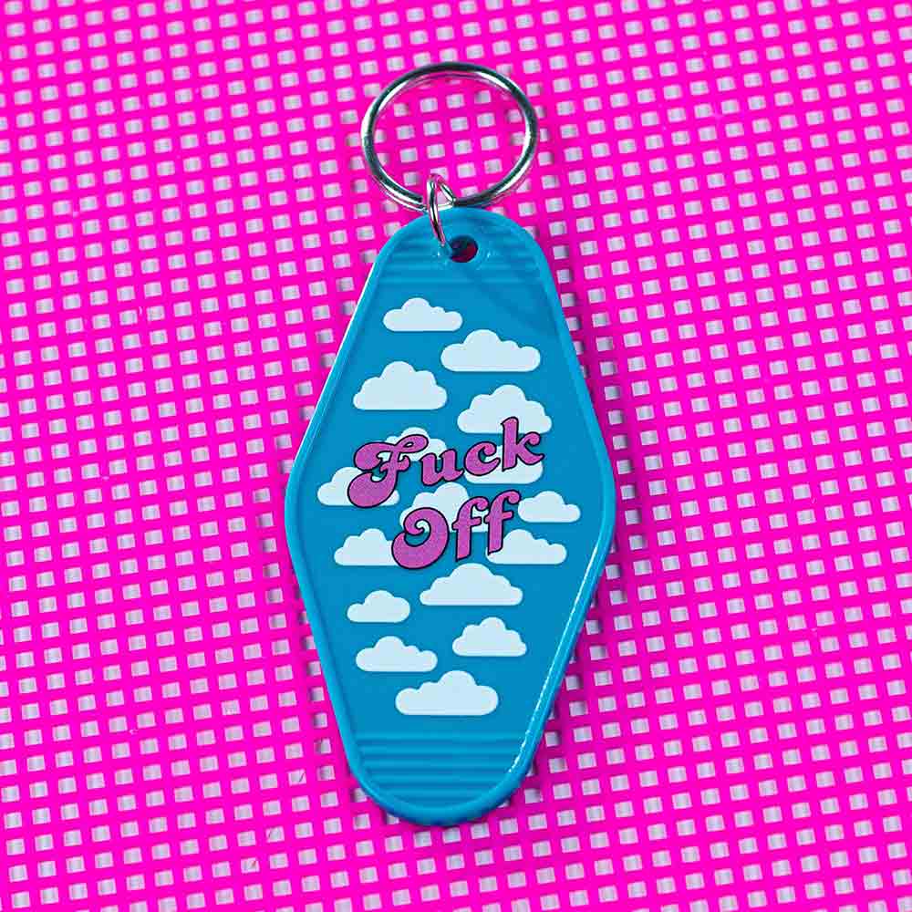 Keychain is 3.5" baby blue plastic with a 1.25" keyring for all your keychains.